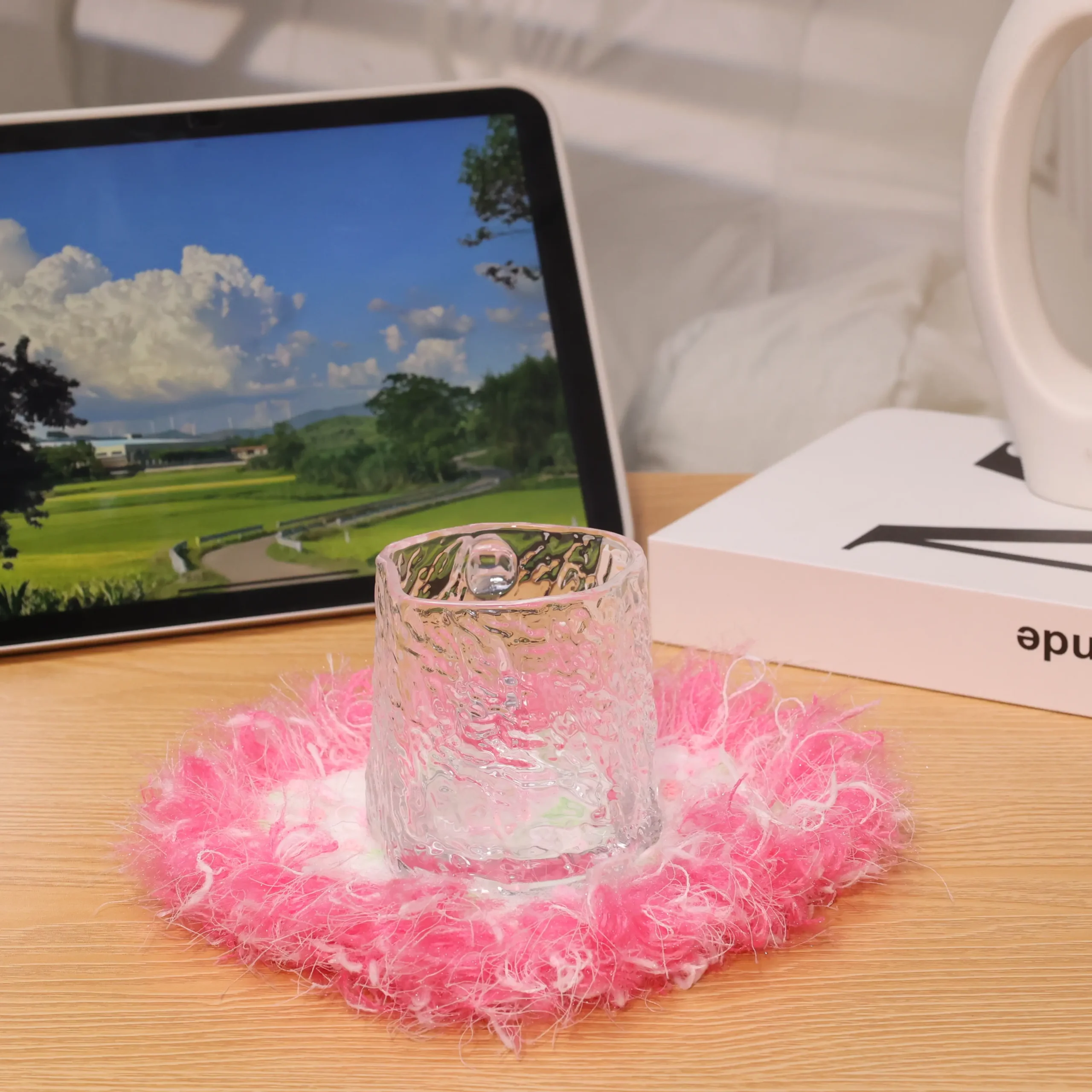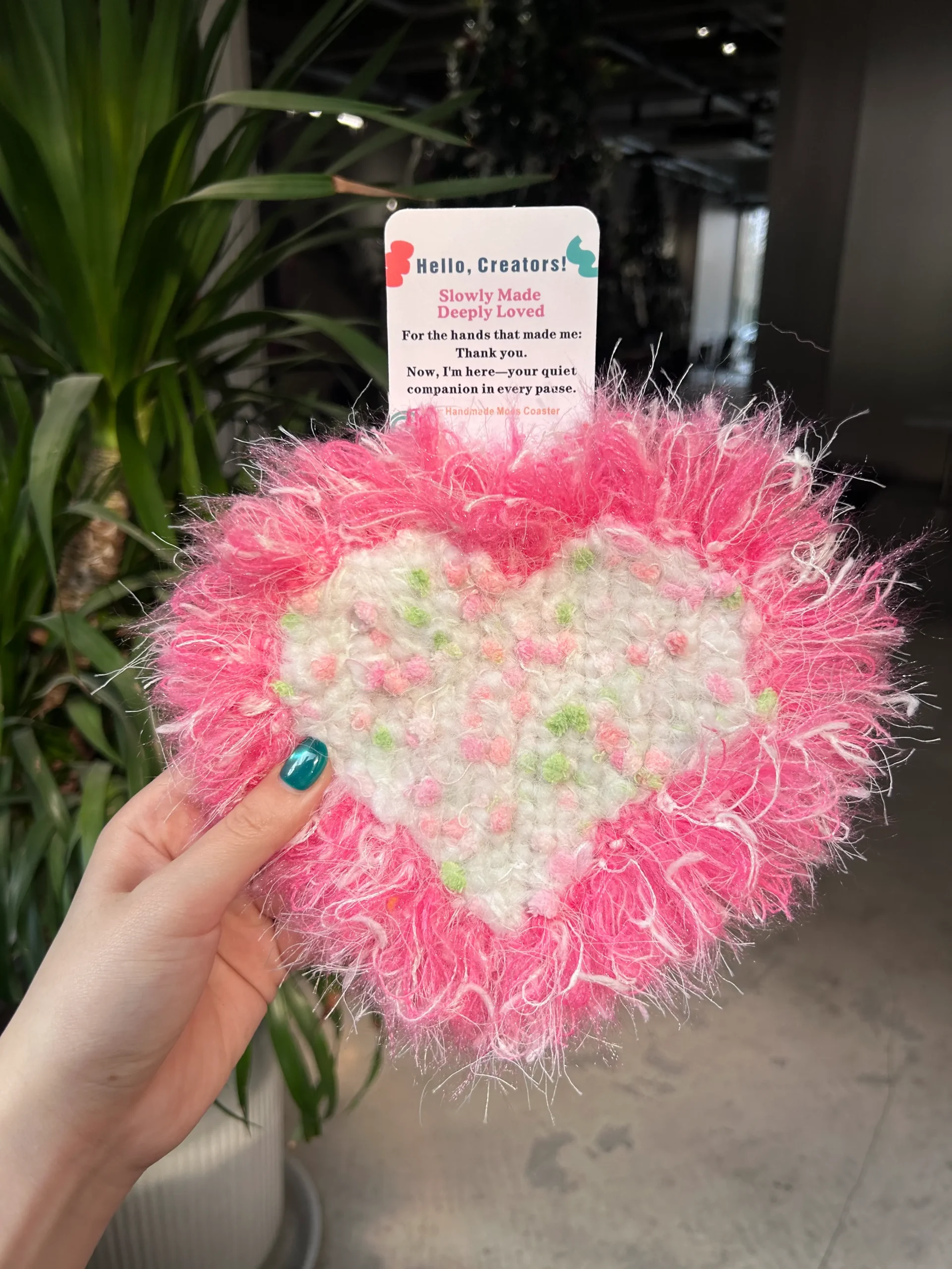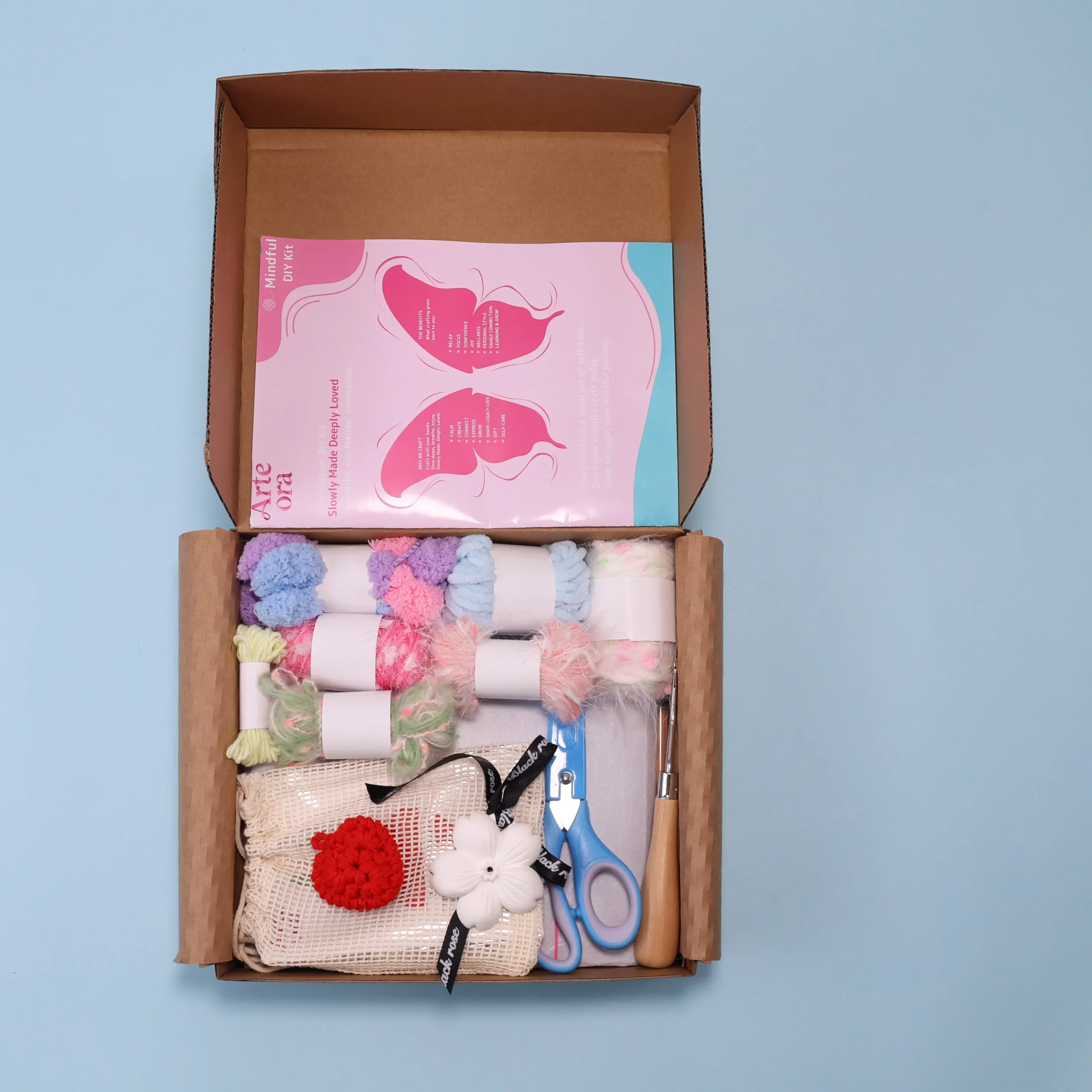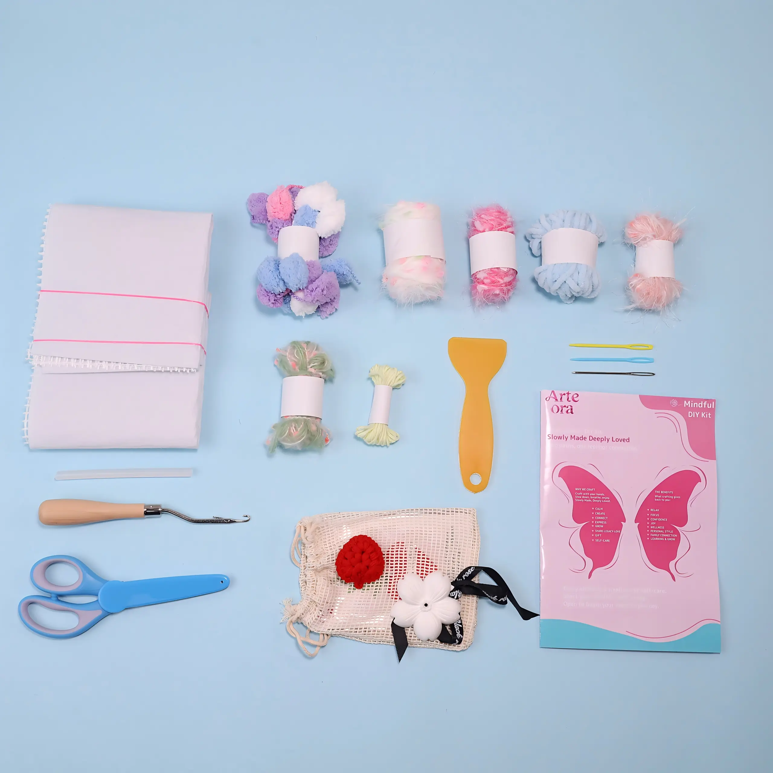 • Soft yarn textures and calming natural colors
