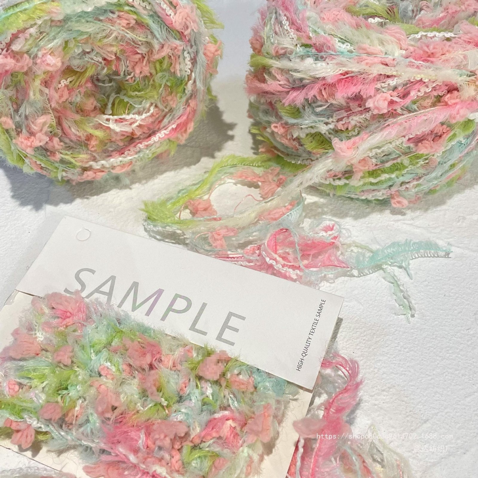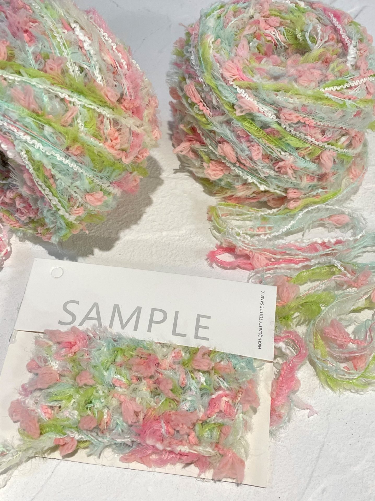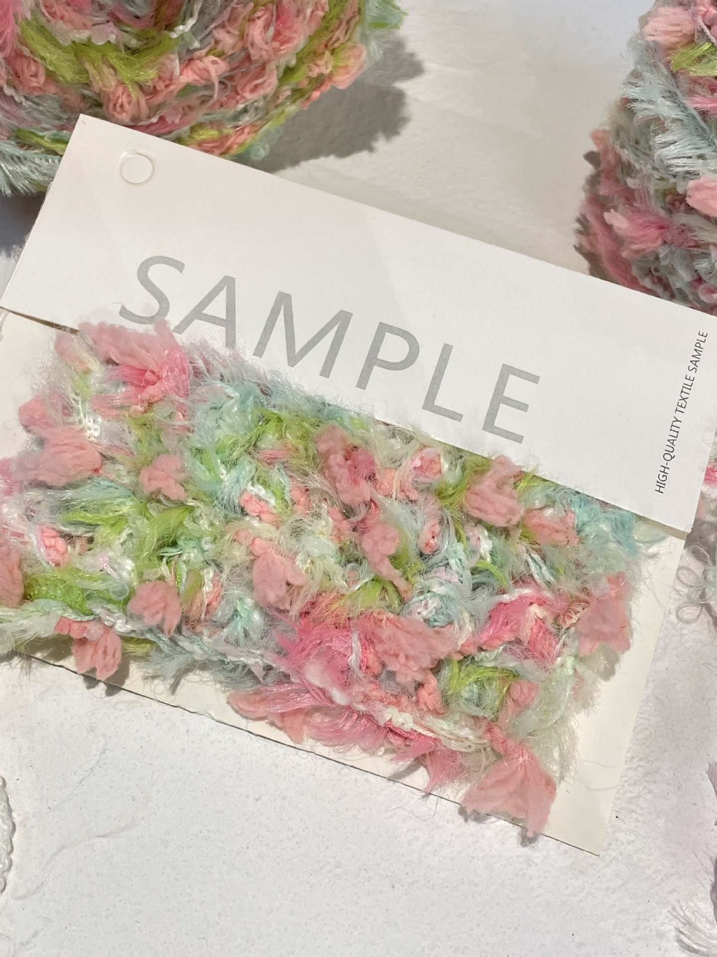 With a soft, tender light green as the base, reminiscent of grass just warmed by the sun, it is dotted with fibers in muted pink and deep rosy red, like early peach and crabapple blossoms, blended with creamy-white fluffy fibers. The overall palette resembles a springtime color palette gently melted by sunlight — soft yet vibrantly alive.