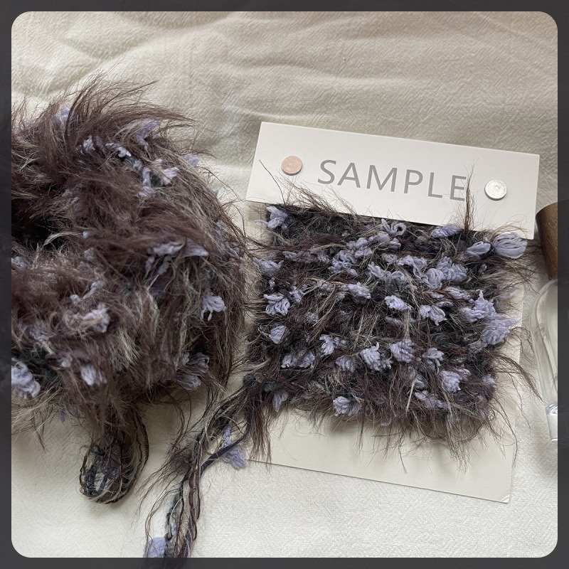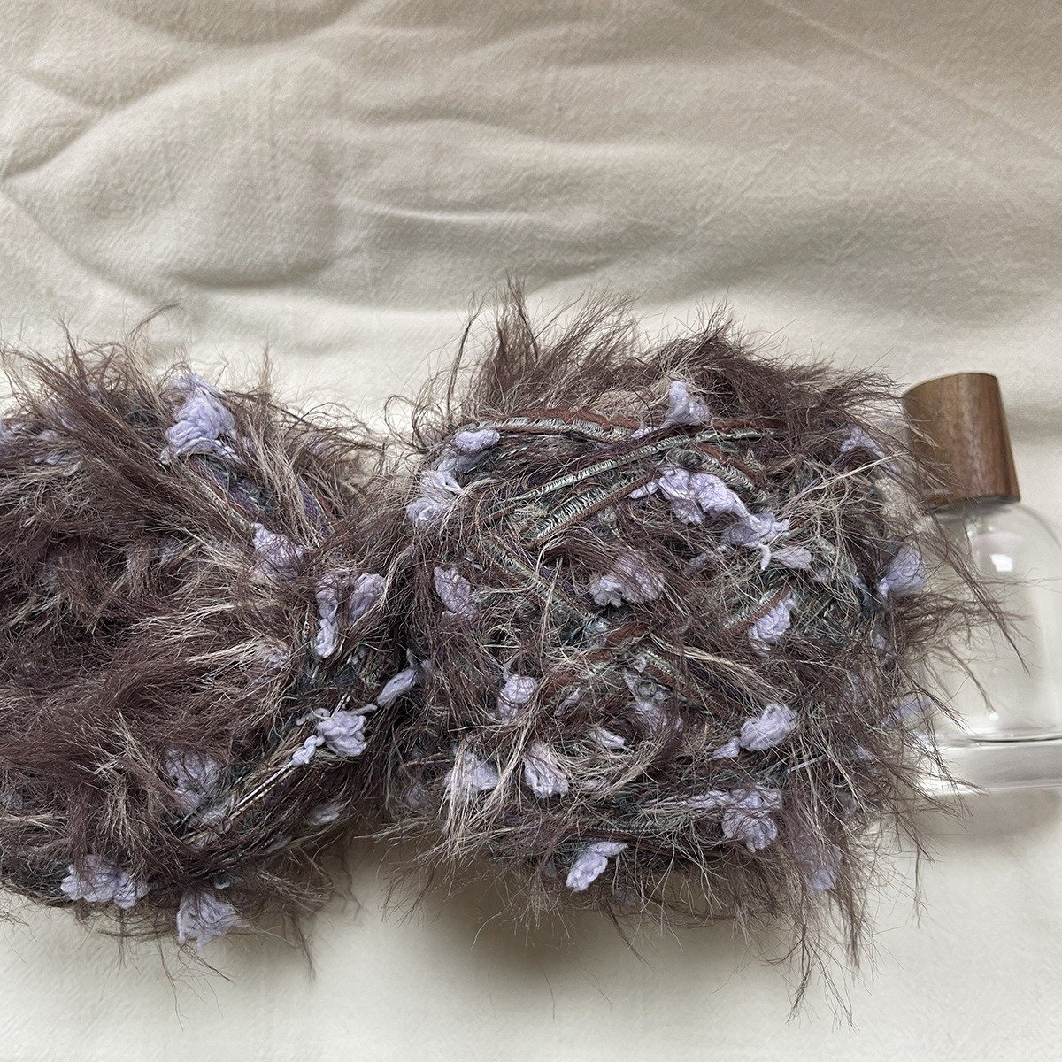 This evocative hand-blended yarn features a rich, dark brown base, swirled with hazy lavender and smoky gray fibers. The result is a plush, textured finish that feels like stepping into a misty valley at dawn—where feathery, long fibers and clustered purple “orchid blooms” create a sense of quiet mystery and poetic beauty.