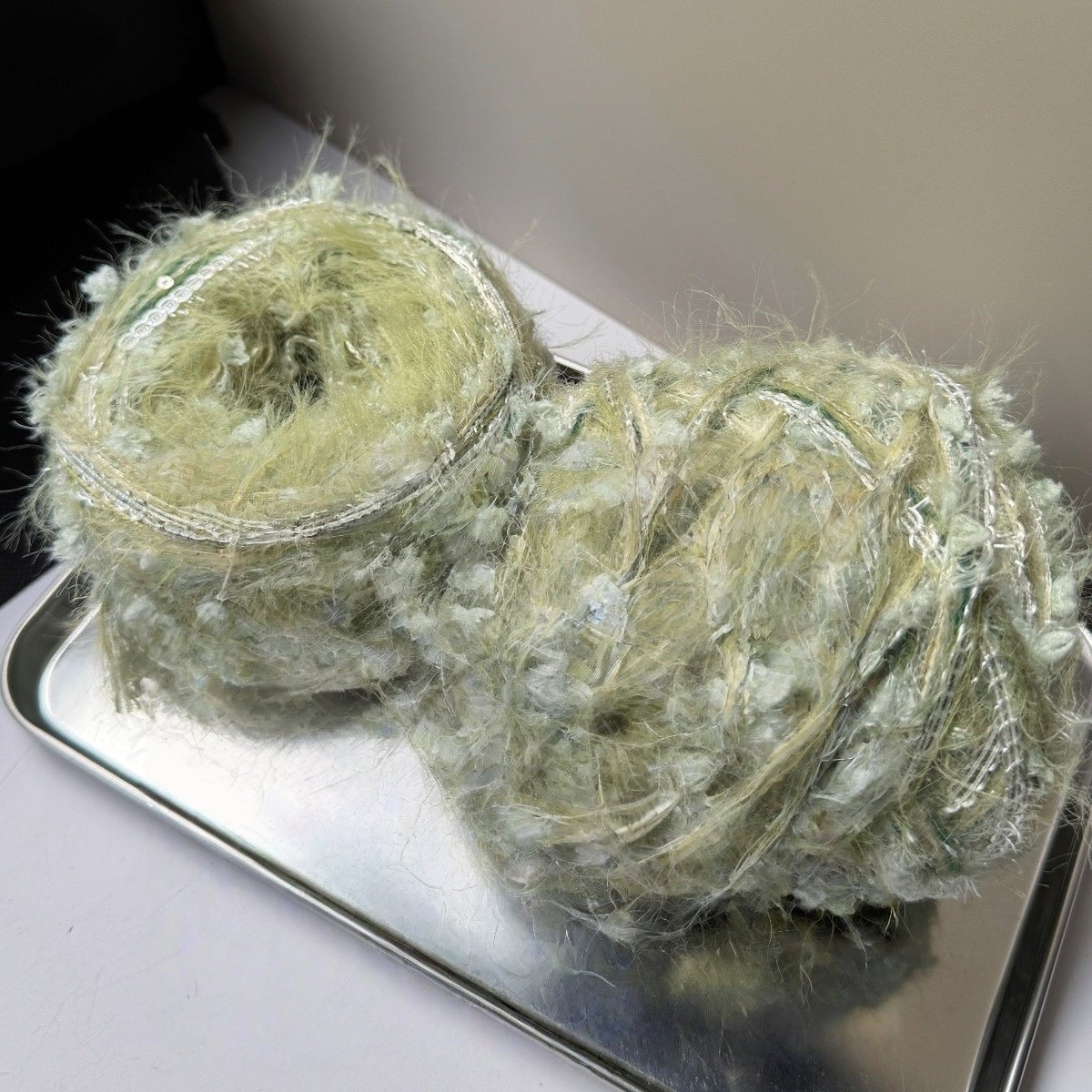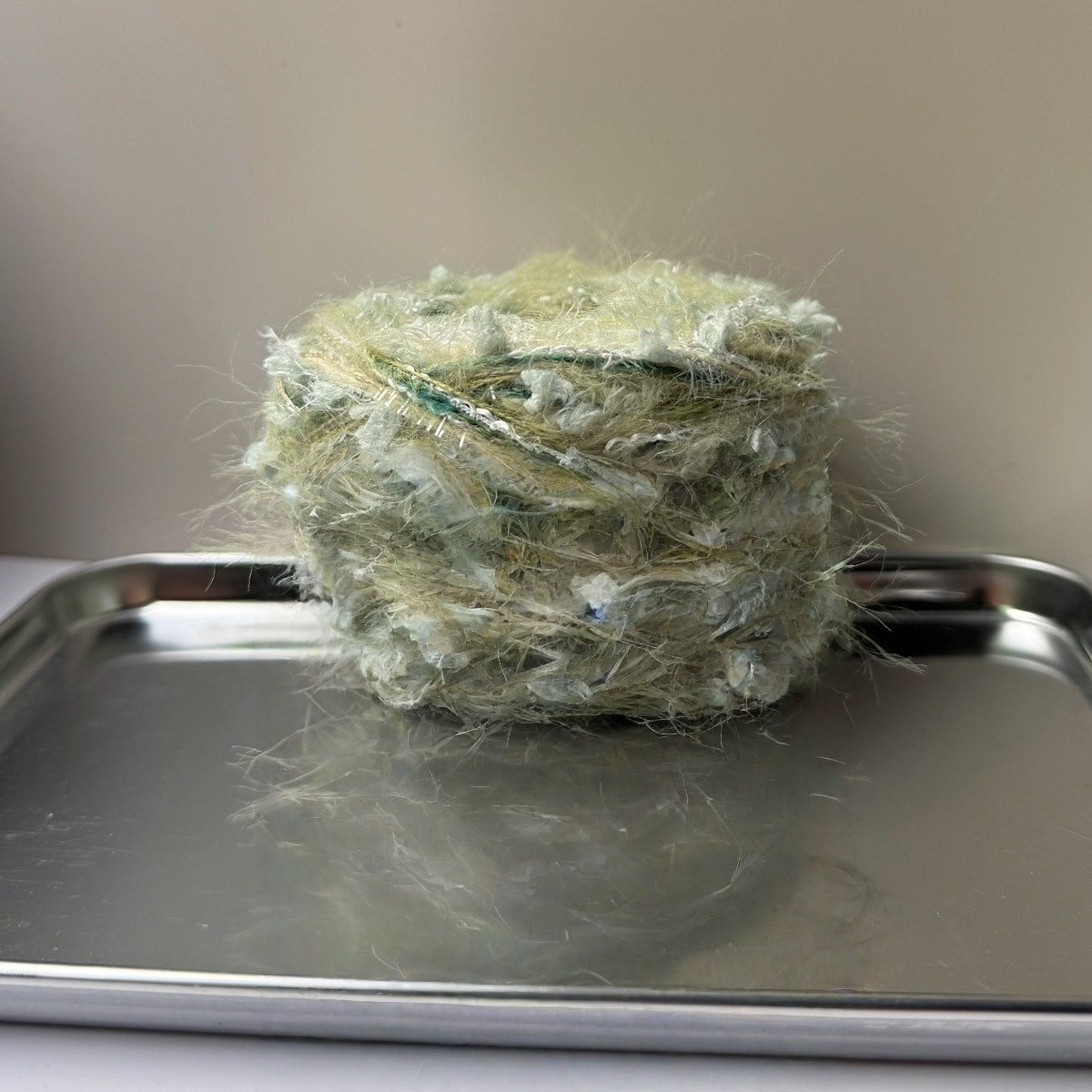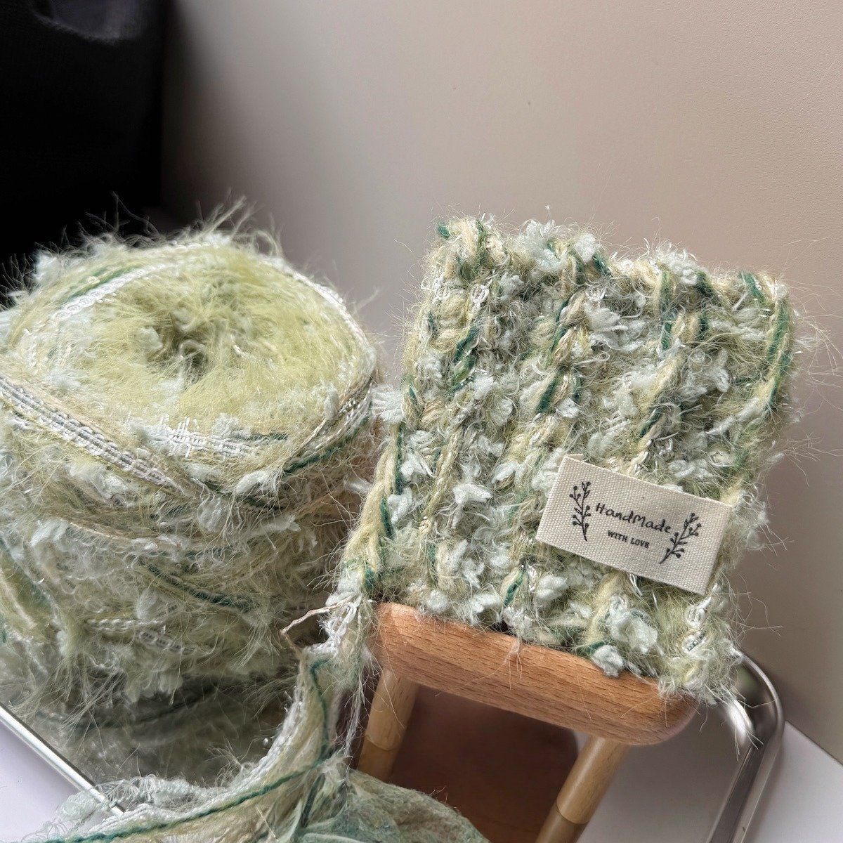 This lively hand-blended yarn features a tender, fresh green base, interwoven with soft off-white and deep forest green fibers. It creates a textured finish just like a sunlit mountain meadow, as if plucked straight from an early morning forest, with the crisp freshness of grass and dew.
